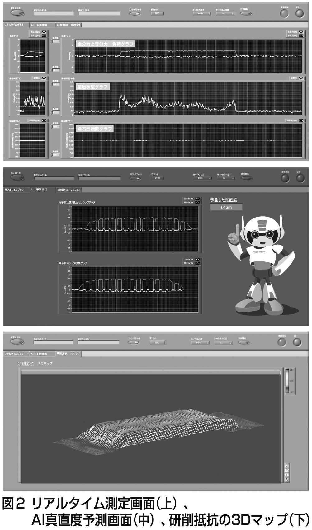 図2はアルミナセラミックスを研削加工した際のデータである。事前に収集した加工時のセンシングデータを基に、AIモデルを作成する。そしてNPXスピンドルによってリアルタイムの測定データを収集し、加工状況から予測される真直精度を数値化できる。また研削抵抗の測定データを基に3次元(3D)マップを作成することも可能である(特許出願中)。