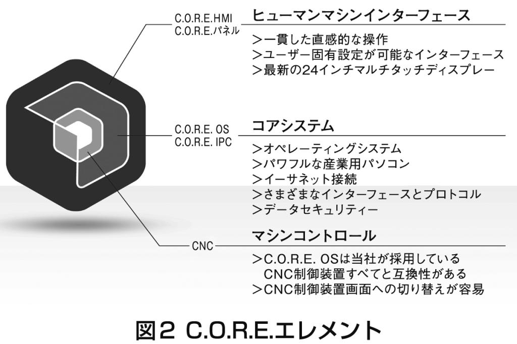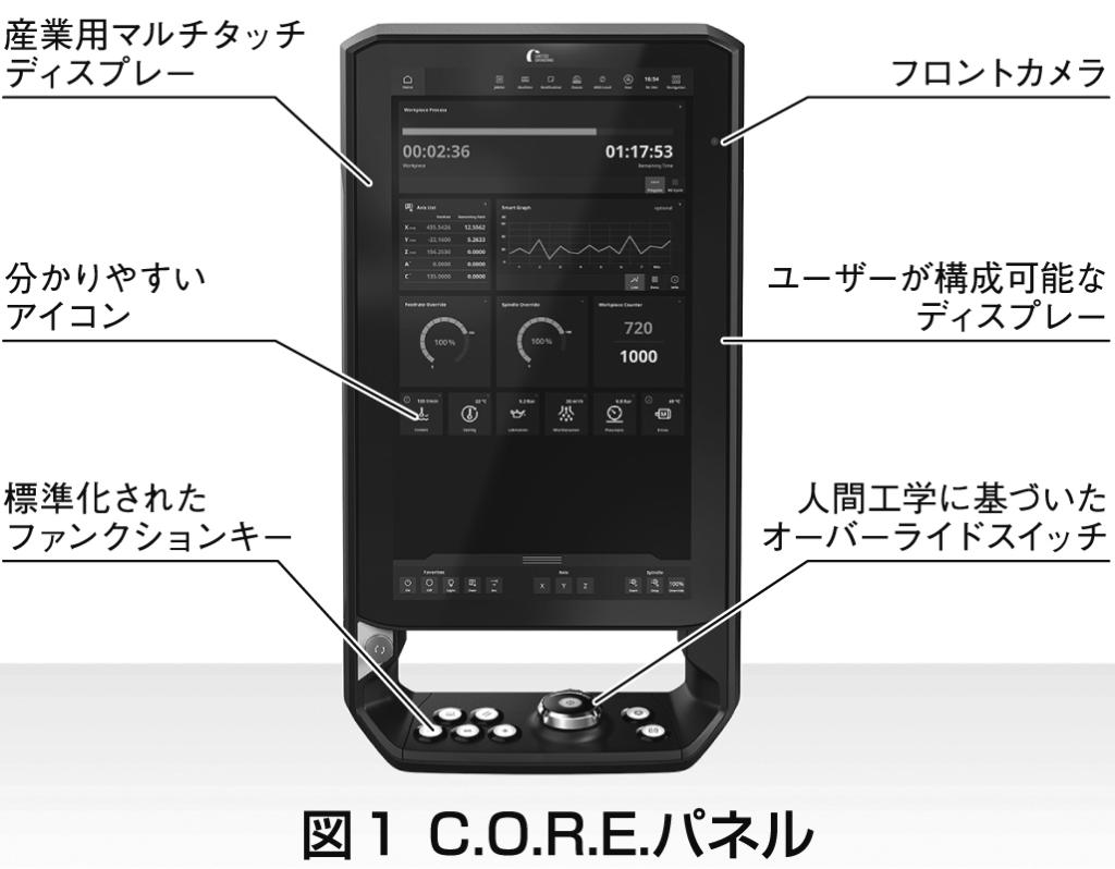 技術的にC.O.R.E.は強力な産業用パソコンとコンピューター数値制御(CNC)装置に対応したOSを基盤とし、イーサネット接続や多様なインターフェース・プロトコルを備えている。これにより、当社の各ブランドの機械間でのデータ交換が容易になり、デジタルソリューションズ製品へのアクセスも可能。さらに、C.O.R.E.パネルにはフロントカメラや近距離無線通信規格「ブルートゥース」が統合されており、リアルタイムで情報交換やサポートができる。人間工学に基づいた設計により、作業環境に応じた柔軟な対応が可能だ(図2)。