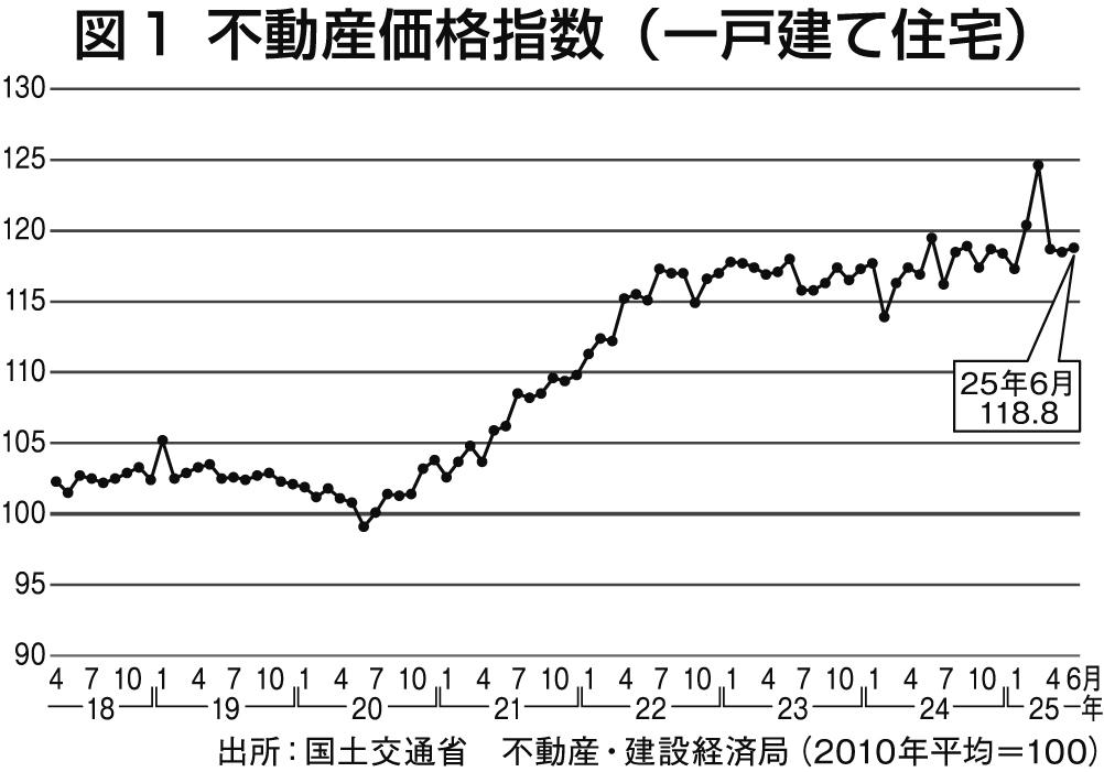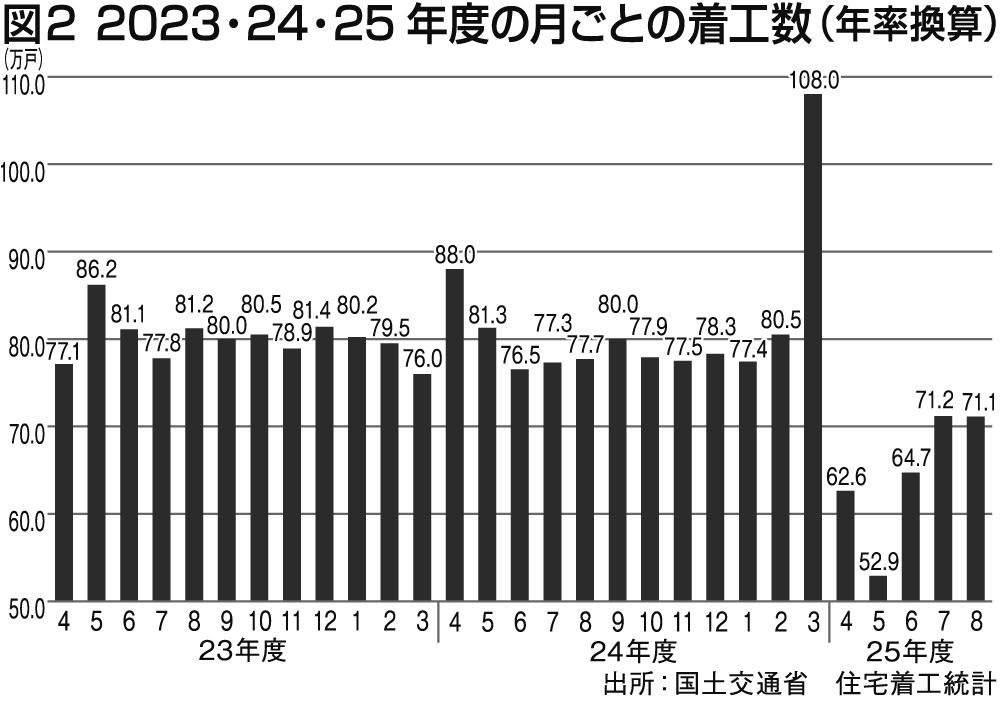 住宅市場は建築資材・エネルギー価格の上昇などによる建築費の高騰や金利の上昇傾向などにより厳しい状況が続いている。8月度の新設着工戸数は全体で6万275戸(前年同月比マイナス9・8%)、持ち家も1万7532戸(前年同月比マイナス10・6%)と、ともに5カ月連続の減少となった。また、季節調整済みの年率換算は71万1000戸と厳しい状況が続いている(図1・2)。