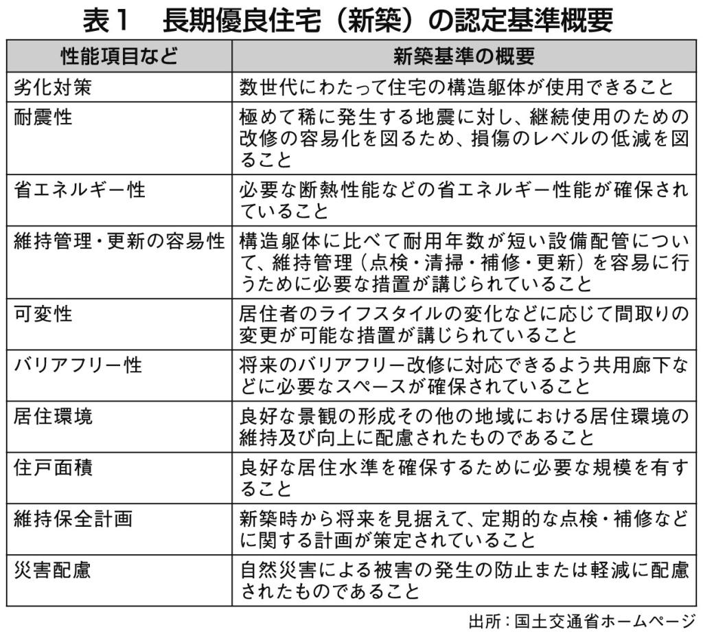 長期優良住宅は名称からも分かるように、長期にわたって住み続けることができる住宅で、具体的には(表1)にある条件を満たす必要がある。耐震性に優れ、通常の使用であれば100年、200年と住み続けることができる。