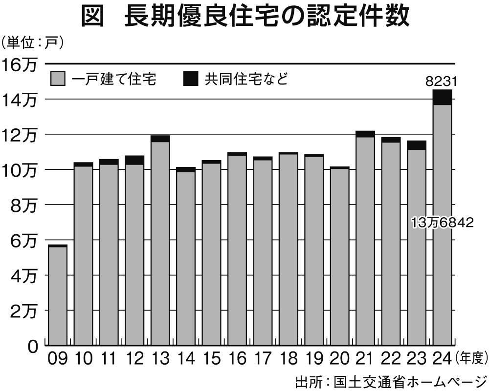 長期優良住宅の認定戸数は着実に増加している。国交省によると、24年度の新築住宅のうち長期優良住宅の認定戸数は、一戸建てが13万6842戸で、一戸建ての新設着工戸数の39・3%と、ほぼ4割を占めるようになっている。ただマンションはまだまだ少なく24年度は8231戸で、新築マンション着工戸数の1・8%にとどまっている(図)。