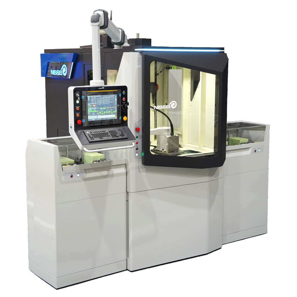 欧州市場の深耕向けにデザイン性を強化した、インサートチップ専用の立型両頭平面研削盤。上下の砥石(といし)と砥石を整えるドレッサーを備えた本体に加え、加工対象物(ワーク)の搬入・搬出を効率的に行うインデックス式のダブルフィーダーシステムを搭載する。加工物搬出入ロボットにより長時間の無人化運転ができる。