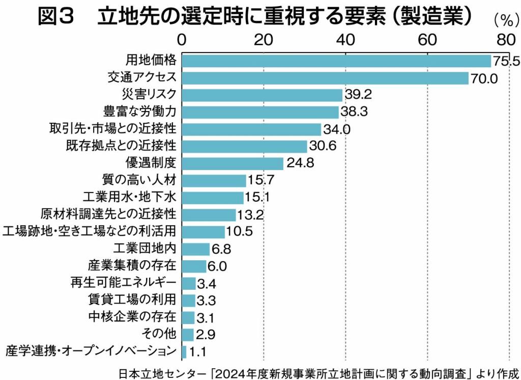 製造業の企業立地の決定にあたっては従来、用地取得費、人件費も含めた操業に係るコスト、交通アクセス、取引先・市場などとの近接性は大きなファクターである。