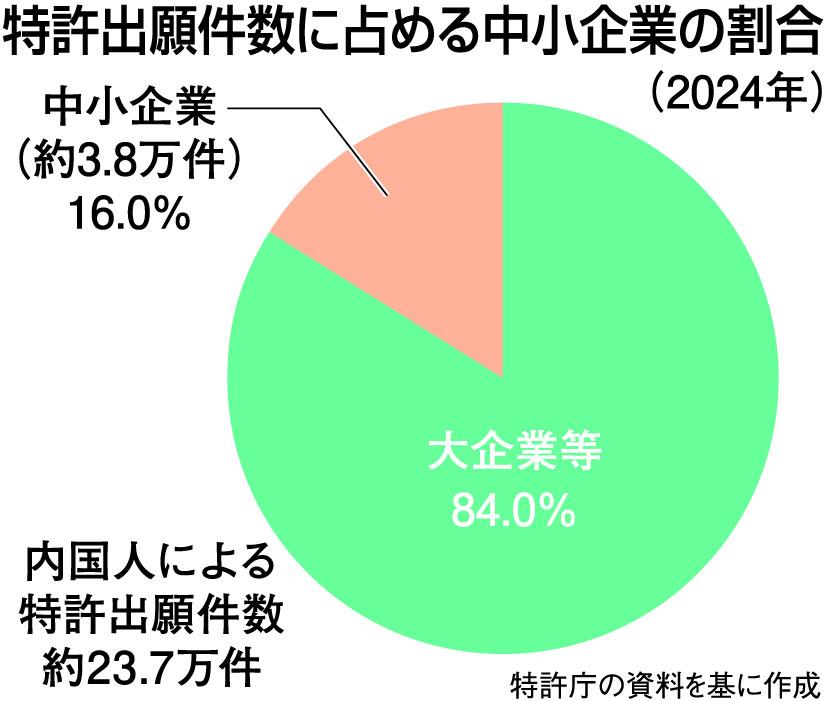 中小企業は日本企業の99%超を占める一方、24年の特許出願件数に占める中小企業の割合は16・0%にとどまる。成長投資や賃上げの原資として稼ぐ力の向上が求められる中、知財をはじめとする無形資産を創出し、戦略的に活用することがこれまで以上に重要になる。権利を取得するだけでなく、その知財をどうビジネスにつなげ、企業の戦略に生かしていくか。知財経営の定着に向けた伴走支援のニーズは、今後さらに高まるはずだ。