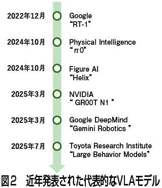 近年の研究ではこうしたロボット基盤モデルは「Vision—Language—Action(VLA)モデル」と呼ばれている(図1)。画像認識や言語理解に加え、実際の動作まで統合的に学習する点が特徴だ。この1年で多くのVLAモデルが立て続けに発表され、研究が急速に進んでいる(図2)。