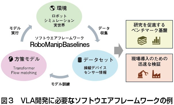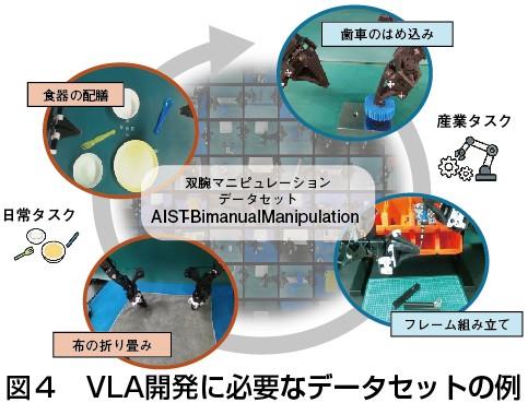 産業技術総合研究所(産総研)も23年度からロボット基盤モデルに関する研究開発を開始し、25年にはソフトウエアフレームワーク「RoboManipBaselines」(図3)や双腕マニピュレーションデータセット(図4)を公開した。さらに企業と連携し、現場タスクに対する小規模模倣学習の有効性を検証しているほか、データ収集の自動化技術も開発した。現場で収集されるデータの質や量をどう高めるかが今後のカギとなる。