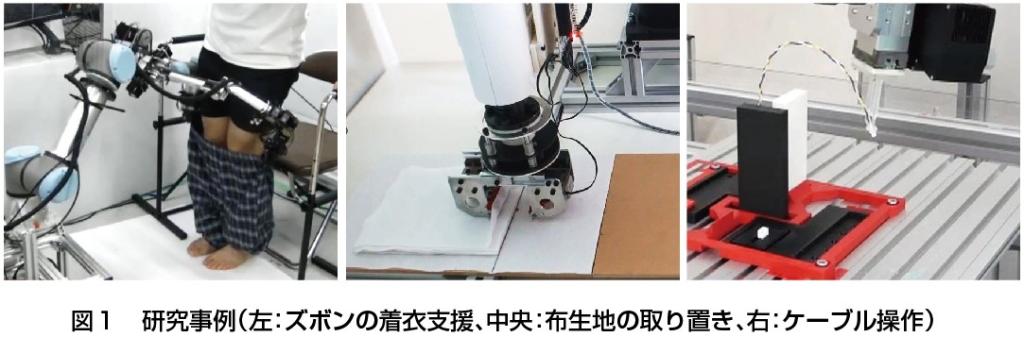 特に注力しているテーマは二つあり、一つは柔軟物の操作だ。例えば、家電などの製造におけるケーブル操作の自動化や(図1右)、布生地の取り置き(図1中央)、着衣支援(図1左)などがある。