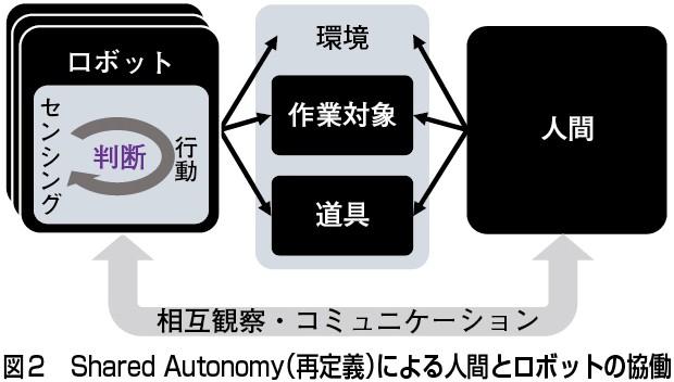 筆者個人の意見としては、作業場での主なプレーヤーはロボットとしつつも、プレイングマネージャー的な立場で人間の介入を積極的に許す仕組みをしっかり作るのが良い。一つのキーワードはShared Autonomy(シェアード・オートノミー、共有自律)である。この言葉は、ロボティクスではこれまで遠隔操作などの文脈で用いられてきたが、自律型ロボットの存在が変質しつつある今、より広い意味で捉え直してもよいと思う。