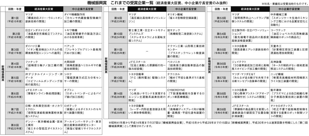 機械振興賞は「研究開発」については独創性、革新性、経済性に優れた機械工業技術に関わる研究開発と、その成果としての実用化によって新製品の製造、製品の品質・性能の改善や生産の合理化に顕著な業績を上げた企業・研究開発担当者が対象。「支援事業」では、支援効果、継続性に優れた支援事業によって、機械産業技術に関わる中小企業が優れた成果を上げた支援機関と担当者が表彰の対象となる。