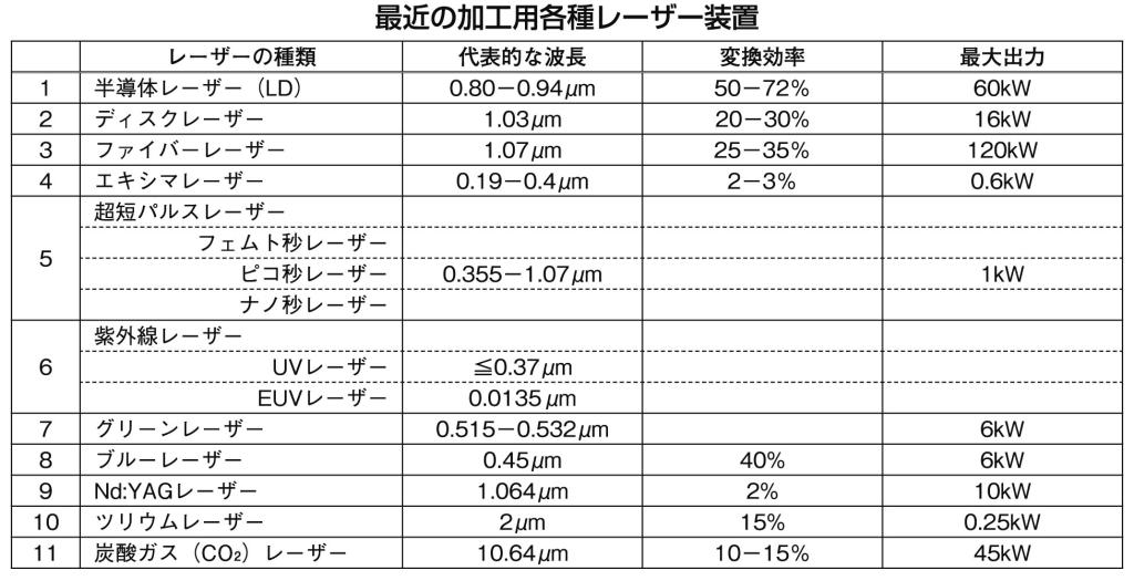 レーザー加工機はその波長により、加工特性が大きく異なる。極短波長のEUV(極端紫外線)レーザーから10・6マイクロメートルの炭酸ガス(CO2)レーザーまで、10種以上のレーザーが開発されている(表)。自動車産業や電機産業をはじめ、造船業、航空宇宙産業、機械産業、半導体産業、エネルギー産業、素材産業などの加工分野で適用されている。