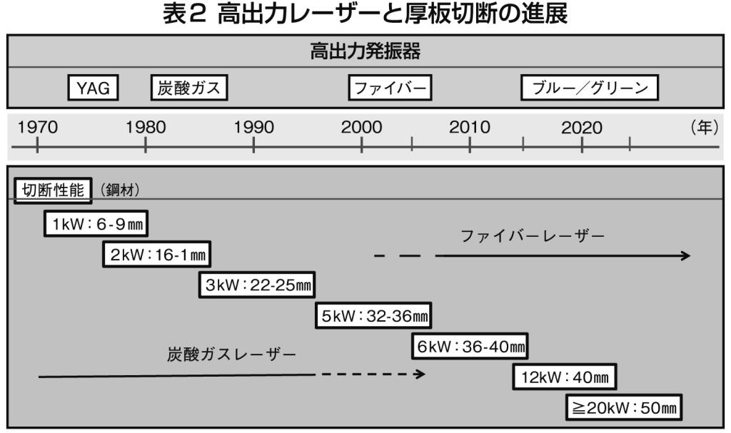 ここ十数年でさまざまなレーザー発振器が登場した。現在の産業用固体レーザーを表1に示す。近年、高出力レーザー加工機はビームモードやスポット径の最適化などの新機能が加わり急速に高性能化が進んだ。その結果、技術的には一定の飽和感を見せつつも、高出力化により加工性能はさらに向上している。厚板切断の進展について表2に時系列で示す。