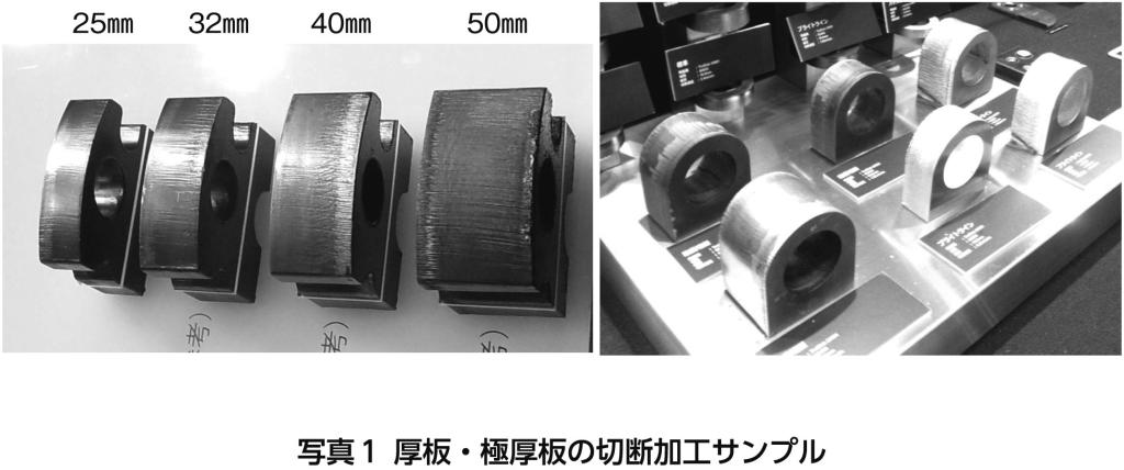 ファイバーレーザー加工機はここ数年で出力が増大し、国産加工機は既に25キロワットを超えている。それに伴って切断可能な板厚が向上し、軟鋼は50ミリメートル(2インチ)までが保証範囲となった。2024年の日本国際工作機械見本市(JIMTOF)で取材した極厚板の切断サンプルを写真1に示す。正に2インチ切断時代の到来である。
