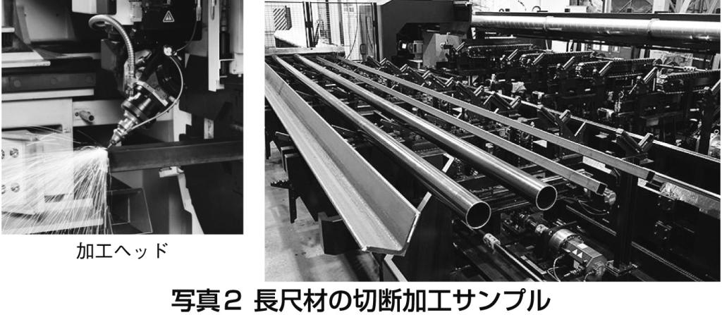一方で、橋梁や建築業では長尺な材料が多く、口径や板厚の拡大が進んでいる。これに伴って、長尺材用レーザー加工機のファイバー化が進み、長さ15メートルまでの丸棒や角材の加工が1台でできるようになった。その加工例を写真2に示す。