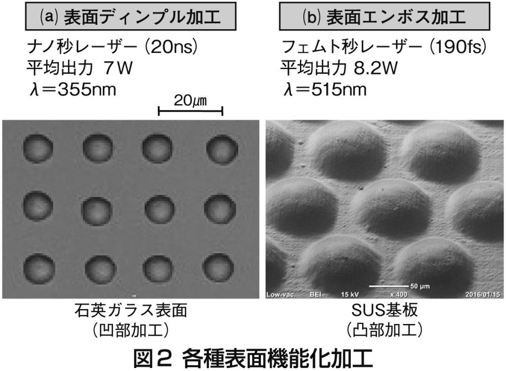 さらに、材料表面新しい機能を付加する「表面機能化」の技術も注目されている。筆者らによる加工例を図2に示す。(a)ナノ秒レーザーによる表面ディンプル加工、(b)フェムト秒レーザーによる表面エンボス加工の例である。一連のレーザー微細加工は、今後ますます期待される成長産業の一つである。