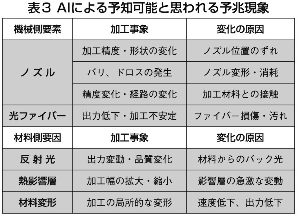 近年は加工における規則性を導き出し、AI(人工知能)を活用して事象を分析・法則化する技術が進展している。とりわけ従来課題とされてきた加工不良の予知が期待されている。参考に、AIによる加工診断の一例を表3に示す。到来が予想されるDX時代においては、こうした技術が一般化すると考えられる。