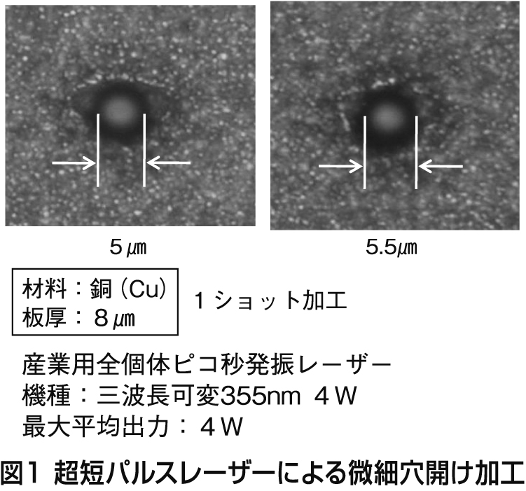 特に、インクジェットプリンターノズルでは、ノズル径は数マイクロ—10マイクロメートル程度で、液滴サイズを制御するために使用されている。また、半導体パッケージ基板のマイクロビア加工では、高密度配線のためビア径は5マイクロ—10マイクロメートル程度が目標とされ、実際の穴加工では板厚マイクロメートル以下の材料で、5マイクロメートル前後の穴径が超短パルスレーザーで得られるようになってきた。筆者らの実験で得られた1ショットのピコ秒レーザーで達成した銅材の微小加工例を図1に示す。