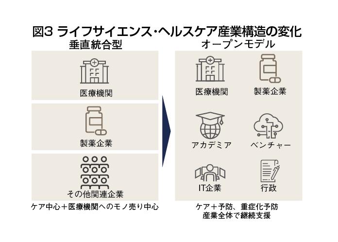 今後は創薬から診療、予防・予測までをつなぐ産業構造の再編が進み、「患者中心の医療モデル」が一層拡大すると見込まれる。特に高齢化社会では発症後の治療だけでなく、発症前の予防や重症化防止の取り組みが経済的・社会的に重要性を増し、ライフサイエンス産業の成長と医療制度の持続性の両立に寄与することが期待されている(図3)。