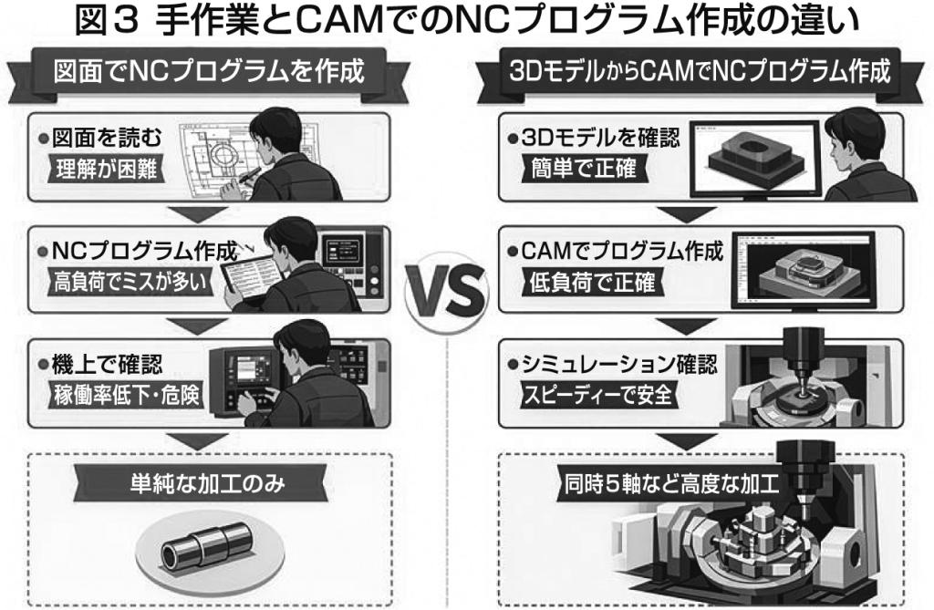 3DCAD/CAMの性能向上により、生産量の平準化や加工品質の安定を実現。さらに、取引先との情報伝達を迅速化し、内製化の促進や外注費削減など、企業や組織の経営面の改善にも貢献する(図3)。
