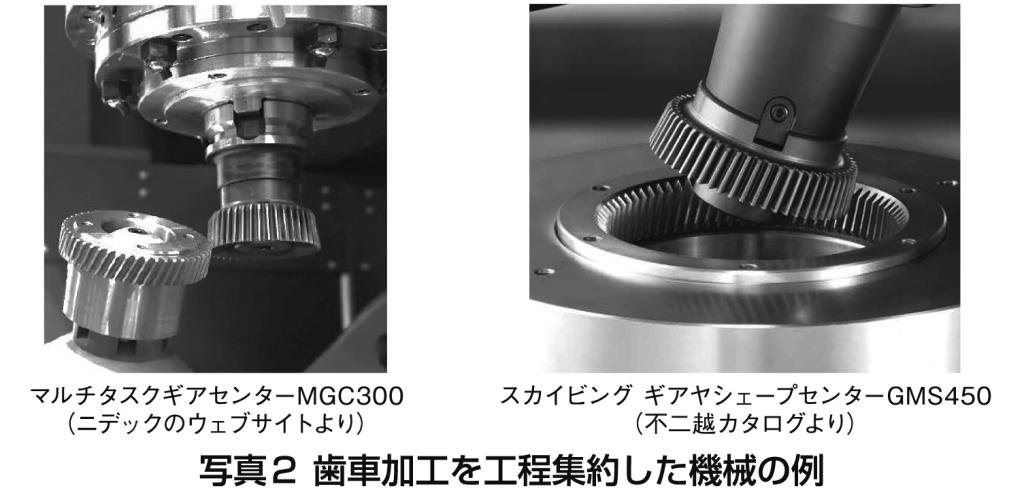 通常、歯車の歯形は、ホブ加工、シェーパー加工、ブローチ加工などによって加工され、ブランク加工やボス穴・キー溝などは別の工程で製造されてきた。最近の日本国際工作機械見本市(JIMTOF)など工作機械の展示会では、ギアスカイビング機能を搭載し、歯車加工を1台で工程集約する機械が多数展示されている。MCをベースに歯車加工が複合化された機械の一例(写真2)を示す。