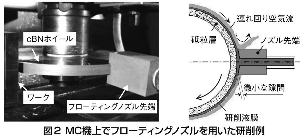 筆者らは連れ回る空気流の内側で、砥石表面に約0・1ミリメートル厚さの均一な液膜を形成して確実に研削液を供給するフローティングノズルの開発に成功している(図2)。このノズルは、自動的にノズル先端と砥石との隙間が調節される機構を持っているため、ノズルが浮いた状態になり、必要最小限の加工液が加工点に供給される。砥石外周の任意の位置で加工しても、確実に加工点に加工液が砥石速度と同じ流速で到達できるため、加工性能が常に安定・向上する技術である。