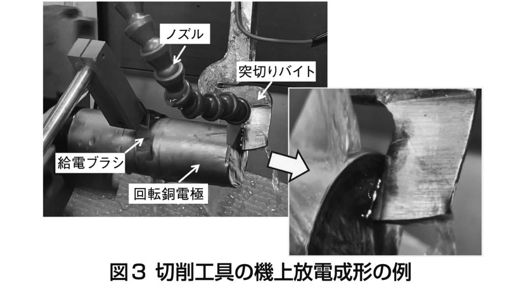 切削機で放電加工を行う取り組みもある。筆者らは工具研削ができる切削機械の開発を目指して、切削+研削+放電加工の複合加工機を提案している。切削送りのGコードである直線補間G01の実行時に、放電ギャップを自動制御できるように工作機械をカスタマイズしている。硬い工具材料を非接触で放電成形し、最後に仕上げ研削する技術が実用化できれば、切削工具の機上成形などが可能になると考えている(図3)。