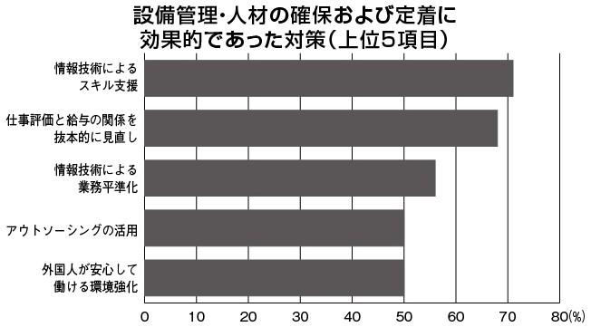 日本プラントメンテナンス協会の「2024年度メンテナンス実態調査」によれば、各社が講じた設備管理・人材の確保および定着に効果的だった対策では、「情報技術によるスキル支援」が71・4%と最も高かった(図)。
