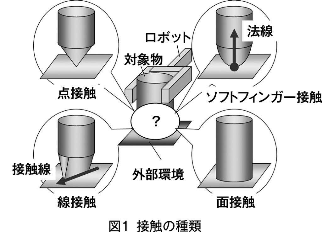 近年、6軸力覚センサーが安価に購入できるようになった。USB接続を用いれば、6軸力が簡便に取得できる。このセンサーを用いると、単に力を検出するだけでなく、接触点位置、接触方向、接触種類も検出できる(図1)。接触方向は、法線方向や接触線方向、接触種類は、点接触、線接触、面接触などである。アクティブセンシングと呼ばれる人間の細かな手探り動作を模して、これらの情報を検出する。