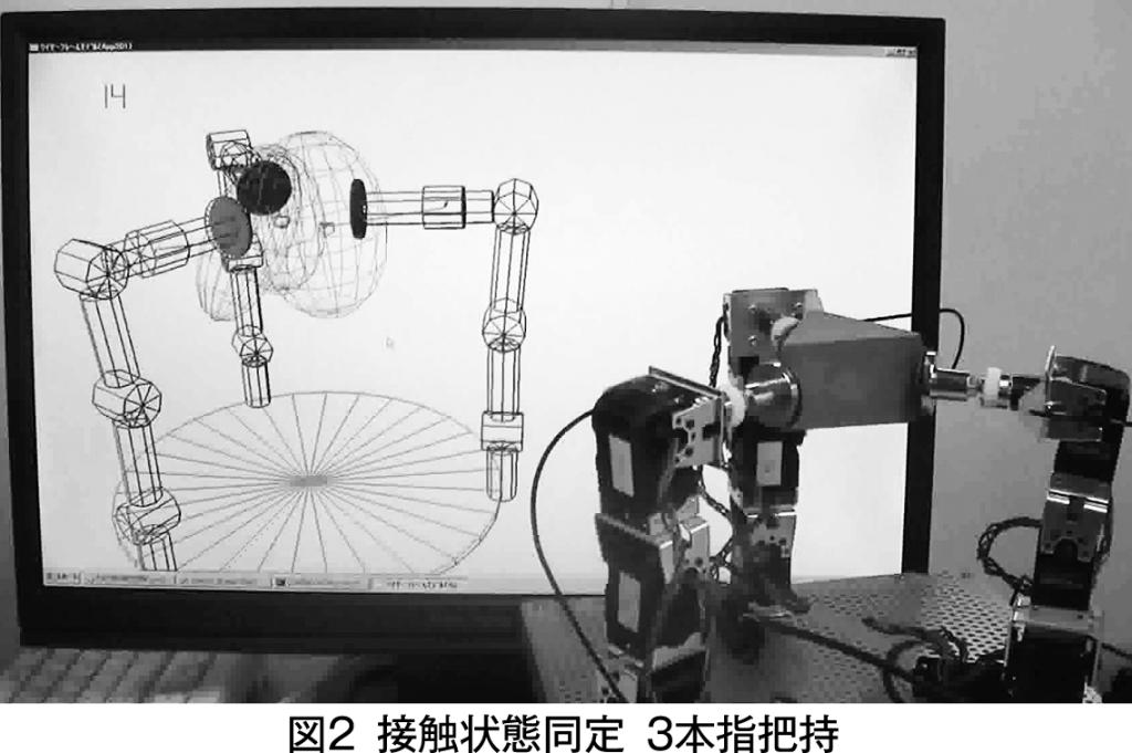 図2は、3本指ハンドの各指に6軸力覚センサーを組み込み、指先の接触状態を検出した実験システムである。