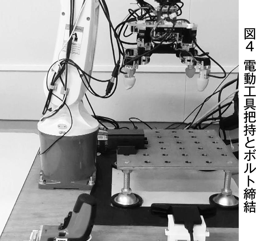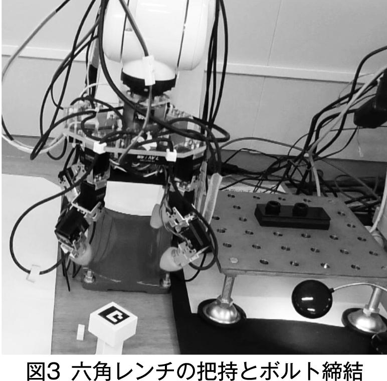 図3は、多指ハンドで六角レンチを把持し、ボルトを締める作業を実現した例である。六角レンチは、3次元(3D)プリンターを用いて研究室で内製した。まず、手のひらのカメラを用いてボルト頭部の座標と六角レンチの座標を検出する。六角レンチを把持し、ボルト頭部の穴に挿入。締結方向に六角レンチを回転させる。手首の6軸力が既定の閾値(いきち)を超えたら締結完了として、もう一つのボルトも同様に差し込み締結する。多指ハンドを用いているため、締結力は弱いが、柔軟な作業を実現した例である。