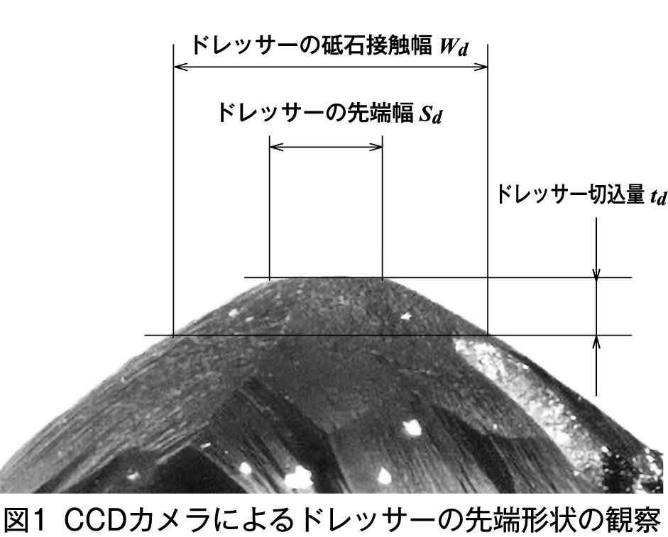 図1にCCDカメラで観察した単石ドレッサーの先端形状を示す。先端を見ると鋭利でないことがわかる。円錐(えんすい)状のドレッサーを用いたとしても、使用していくにつれ摩耗し平坦化する。この平坦部をドレッサーの先端幅という。ドレッシングする際はドレッサーを砥石に対して、例えば20マイクロメートル(マイクロは100万分の1)程度切り込むが、その際のドレッサーと砥石が接触する幅をドレッサーの砥石接触幅という。これらの幅とドレッシングリードとの関係で、砥石外周面上の形状が決まってくる。