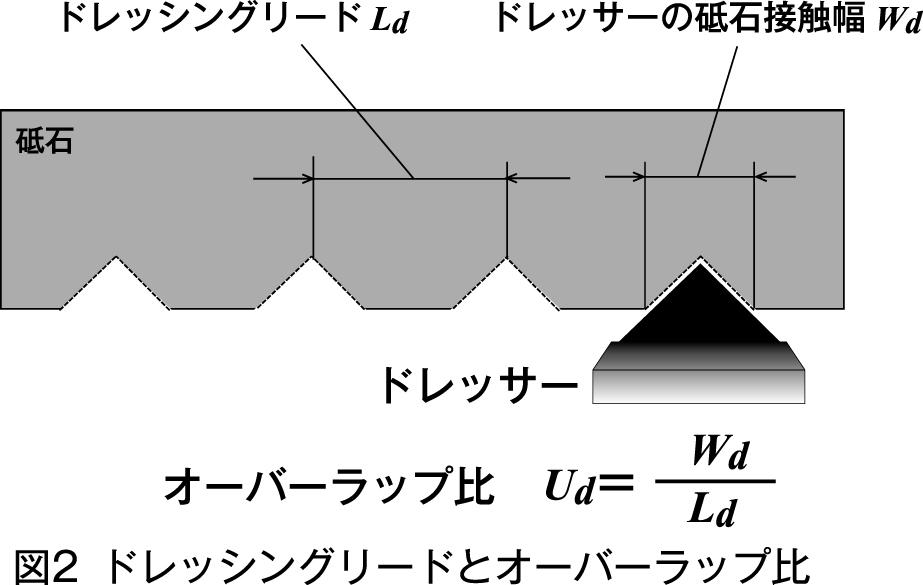 図2に、ドレッシングリードと砥石先端幅との関係を示す。ドレッシングリードLdとは、砥石が1回転する間にドレッサーが移動する量である。これと砥石接触幅Wdとの大小関係により成形される砥石外周面形状に違いを生じる。例えば、同じドレッシングリードでドレッシングしたとしても、ドレッサーが摩耗すればWdが変化するため、生成される砥石表面形状はWdに依存して変化する。これが仕上げ面粗さがばらつく要因の一つである。そこで、ドレッサーの砥石接触幅WdをドレッシングリードLdで除したものをオーバーラップ比Udと定義し、ドレッシングを行う際にはUdが一定になるように砥石接触幅に合わせてドレッシングリードを変えるようにドレッシングを行う。これにより、どのようなドレッサーでも同様な砥石表面を成形することができる。