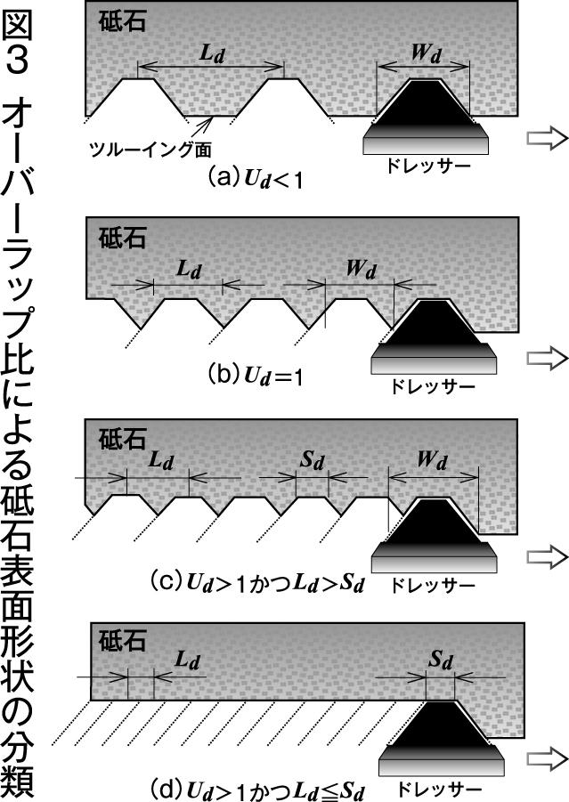 図3に示すように、オーバーラップ比Udにより砥石表面形状は4形状に分類できる。 (a)がUd<1の条件であり、ドレッシングリードLdがドレッサー砥石接触幅Wdよりも大きいためツルーイング面が残ってしまう。(b)がUd=1の条件であり、 LdとWdが同じため切れ刃先端の間隔が最も長く、また切れ刃高さももっと高い。(c)がUd>1かつLd>Sdの条件であり、小さな切れ刃が多く創成される。(d)がUd>1かつLd≦Sdの条件であり、ドレッサーの先端幅よりもドレッシングリードが短いため、鋭利な切れ刃が創成されない。