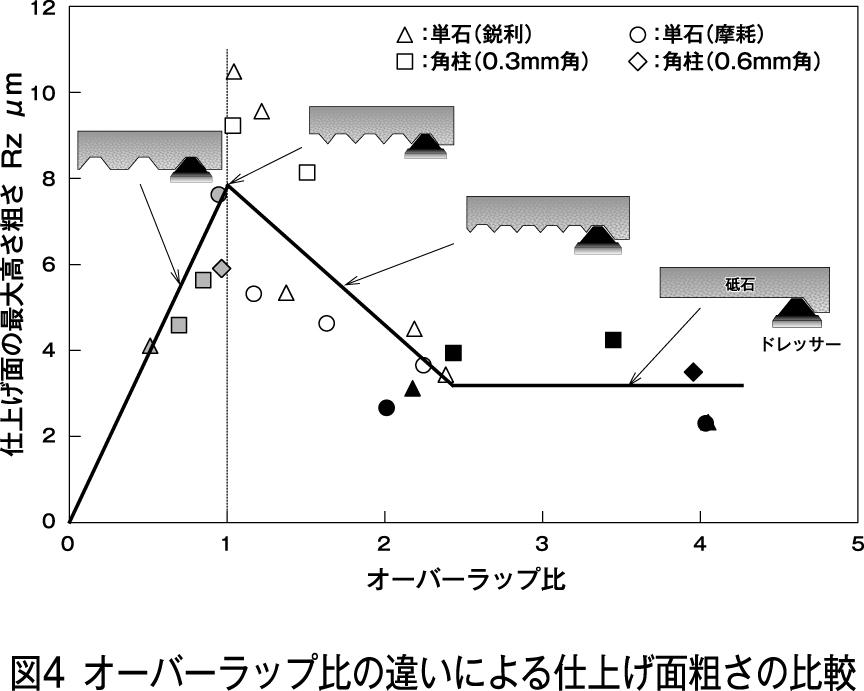 図4にオーバーラップ比の違いによる仕上げ面粗さの比較を示す。4種類のドレッサーを用いて任意のオーバーラップ比で研削したが、ドレッサーの形状に依存せずに、Udが0から1に近づくにつれ大きくなっていき、Ud=1付近で最も大きくなり、1を過ぎるとまた減少し、2付近から一定になる傾向となった。これはオーバーラップ比の違いにより砥石表面形状が異なっていることに起因する。