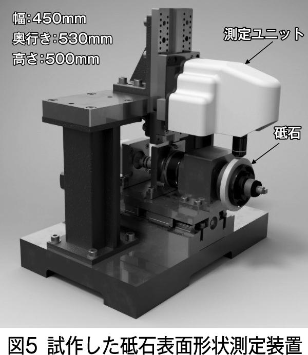 そこで我々は、図5に示す砥石表面形状測定装置を試作している。これは三鷹光器製の非接触表面性状測定装置の測定ユニットを用いたものである。現時点では機外測定となっているが、最近はレーザーを用いた測定装置が小型化してきているため、機内測定も検討しているところである。