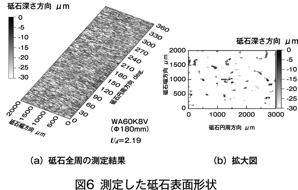 測定結果の一例を図6に示す。(a)は直径180ミリメートルの砥石外周面360度を幅2ミリメートルで測定した結果である。どれが砥粒(とりゅう)かわからないが、(b)のように図を拡大すると砥粒が点在していることがよくわかる。この測定結果を用いることにより、研削仕上げ面形状の予測が可能となる。