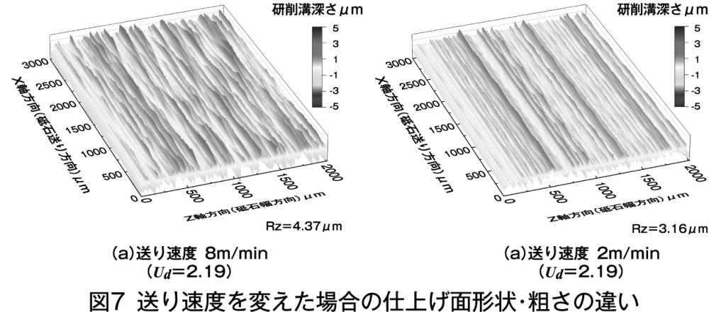 これを図3と比較してみると、図3(a)のUd<1では、Udが小さいとツルーイング面が残っているため切れ刃は平坦化していることから、仕上げ面粗さは良い結果となっている。
