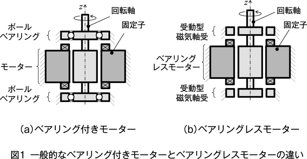 図1(a)、(b)にボールベアリング付きモーターおよびベアリングレスモーターのコンセプトを示す。一般的に、モーターには2個のボールベアリングが取り付けられ、回転軸が機械的に支持されている。一方、ベアリングレスモーターは、ボールベアリングが受動型磁気軸受に置き換えられ、さらにモーターがベアリングレスモーターに置き換えられている。