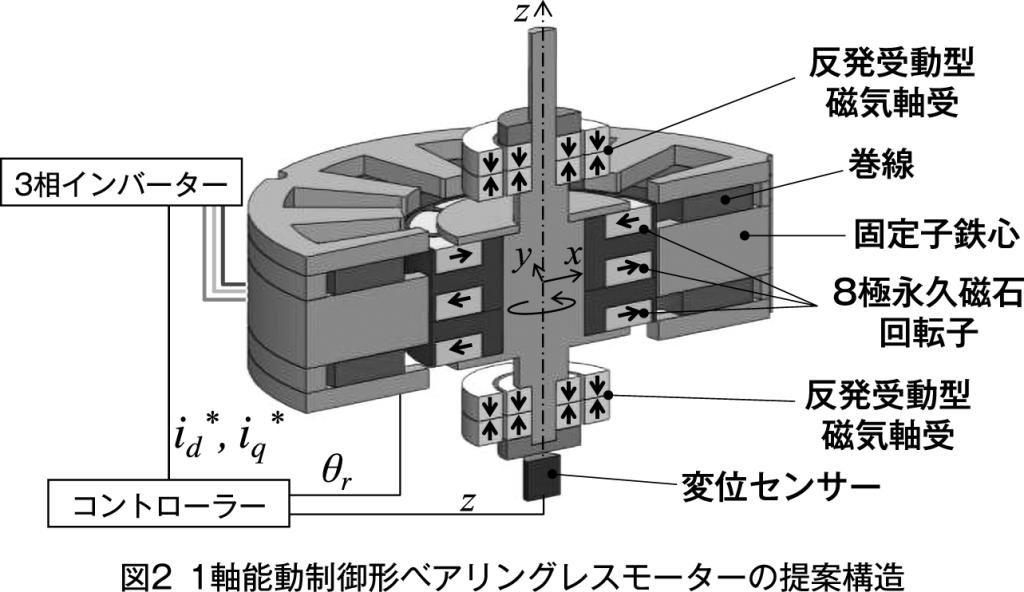 提案構造は、軸方向力および回転トルクを、それぞれd軸およびq軸電流にて発生させることができるシングルドライブベアリングレスモーターであり、3相インバーター1台のみで、磁気支持と回転を実現することができる。d軸電流とは、回転子を磁気支持するための電流であり、q軸電流は回転トルクを発生させるための電流である。