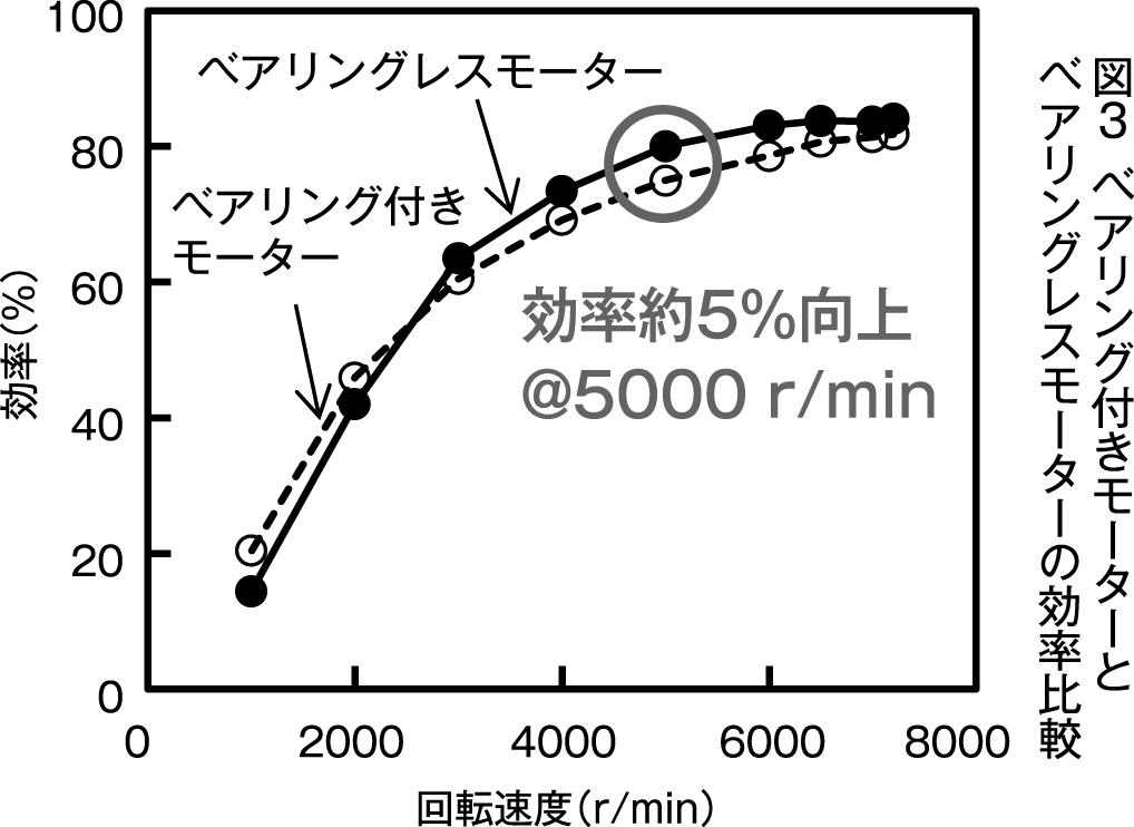 図3にベアリング付きモーターとベアリングレスモーターの効率を比較した結果を示す。これまで、ベアリングレス化による効率向上効果は実証されておらず、定説では数万回転以上になるとベアリングレスモーターの方が高効率になるといわれていた。試作機の定格回転速度は毎分7200回転であるため、ベアリングレス化による効率向上効果があるかは予想が付かずハイリスクな研究であった。