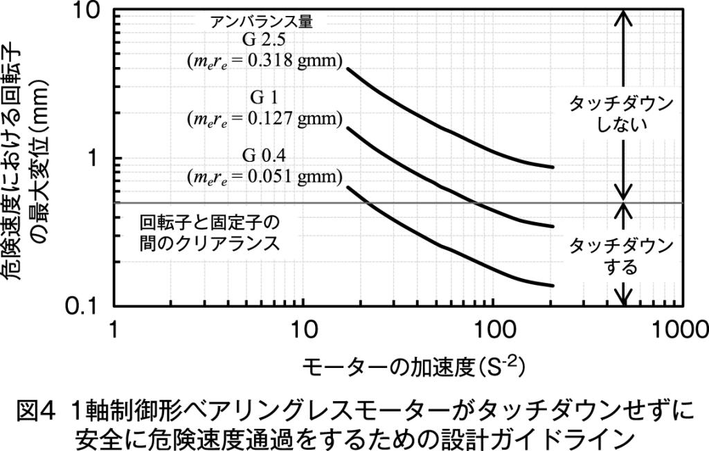 そこで、過電流リミットを無効にしてモーターを急加速させてみたところ、偶然にもタッチダウンせずに危険速度を通過させることに成功し、毎分3万回転までの安定な浮上回転に成功した。この偶然の成功から、図4に示す1軸制御形ベアリングレスモーターの設計ガイドラインを作成し、タッチダウンせずに危険速度を通過するために必要なモーターの加速度、固定子と回転子の間のギャップ長、アンバランス量の関係を理論的に導き出し、危険速度通過の体系的理論を構築した。