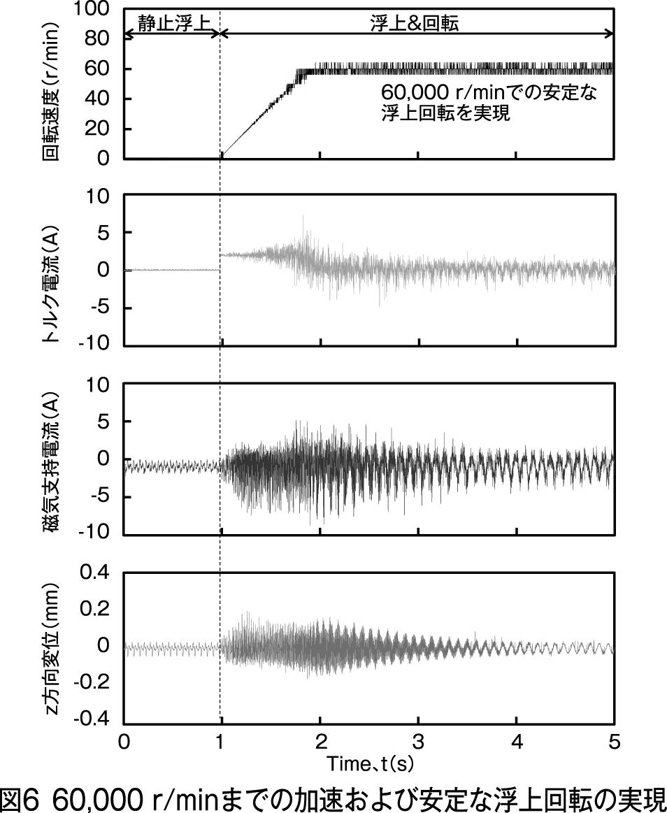 危険速度通過を実現した後、回転速度の限界は何で決まるのかという質問を多く受けるようになり、さらなる高速化にチャレンジした。図6に、毎分6万回転までの加速波形を示す。回転速度が増加するにつれ、デジタル制御の時間遅れの影響が大きくなり、毎分3万回転以上での安定な浮上回転は容易ではなかった。実際に、一般的な時間遅れ補償やdq軸間の非干渉制御を組み込むだけでは安定な磁気浮上は実現できなかった。