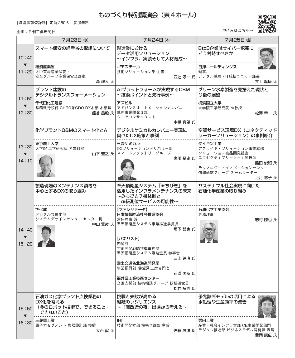 また「ものづくり特別講演会」(表)は、企画を日刊工業新聞社が担当。素材やエネルギー関連企業のプラントメンテナンスに関連する、最新動向が紹介される。