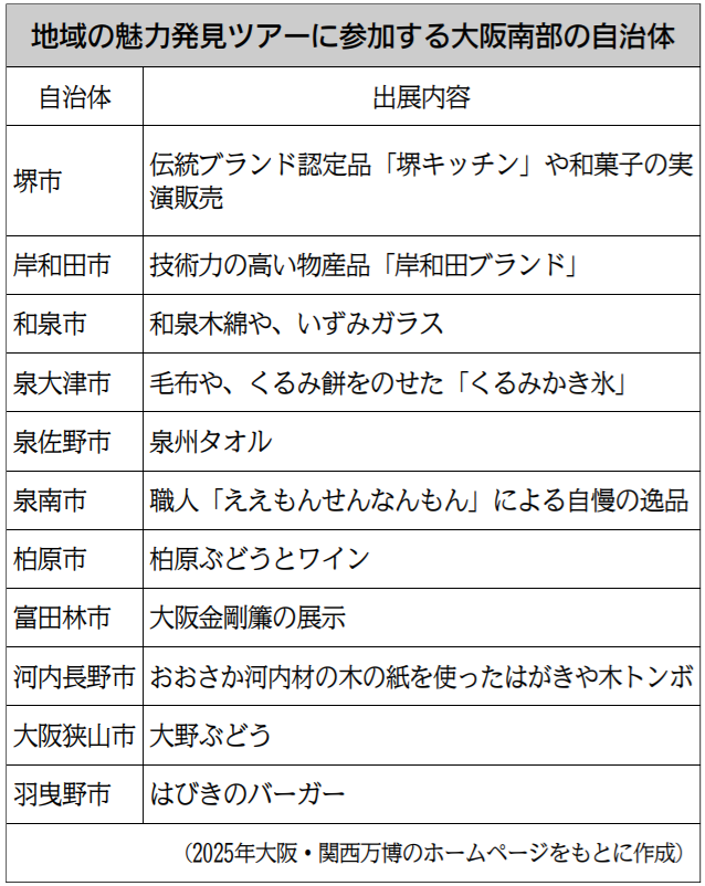 2025年大阪・関西万博が開幕し3カ月が経過した。半年間の万博開催期間の折り返し地点にあたる。大阪府の堺市や岸和田市、泉佐野市などを擁する泉州地域、富田林市や河内長野市、羽曳野市などを擁する南河内地域を含む大阪南部地域の多くの自治体も参加する。万博への参加を通し、自治体や企業がそれぞれの強みをアピールし、自社の事業拡大や地域の活性化につなげる。