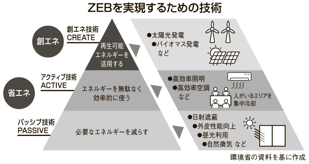 ZEBを構築するには、消費エネルギーを減らすための技術(パッシブ技術)を取り入れる必要がある。外壁や屋根などの断熱・気密性能を高めた上で、冬は日射を利用して暖房効率を上げ、夏は日射を遮蔽(しゃへい)して冷房負荷を低減する。