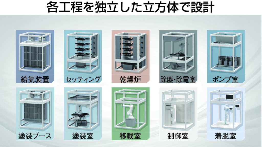 具体的には、ロボット搬送によるコンベヤーレス化、乾燥炉の小型化と熱源のダウンサイジング、排気循環によるファン容量削減、最適な塗装方法による塗料使用量の低減や、工場・現場での工期短縮、ユニット化による同一品質のグローバル展開、柔軟なレイアウト変更などが挙げられる。