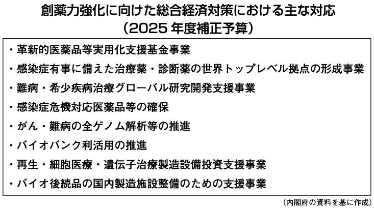 政府は総合経済対策で事業規模が約3300億円となる創薬力強化の政策パッケージを公表した(表)。そのうち、25年度補正予算では政府全体で1800億円規模を計上した。