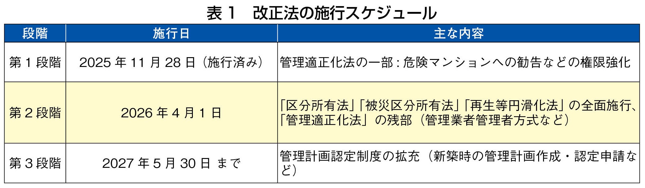 今回の改正は「区分所有法」「マンションの再生等の円滑化に関する法律(旧・建替え等円滑化法から改題)」「被災区分所有法」「マンション管理適正化法」の4法にまたがる包括的なものである。施行は3段階に分かれる(表1)。