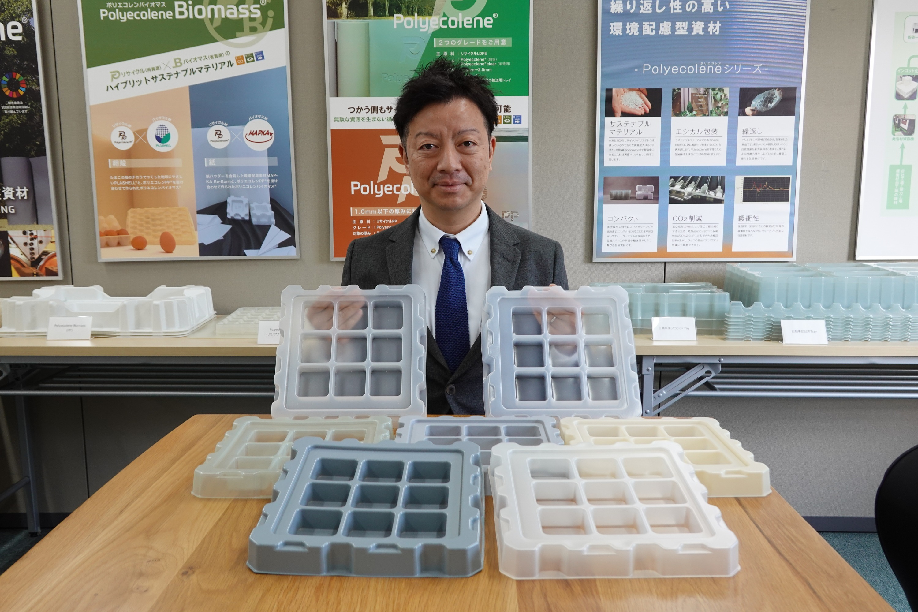 和光紙器(川口市)は段ボールなどの梱包・包装資材を手がける。現在はサーキュラーエコノミー(循環経済)を推進している。このほど100%リサイクルポリエチレン(LDPE)を使った環境配慮型資材「ポリエコレン」を開発した。内外で発生した廃プラをペレット化した後にシート状にし、真空成形によって製品化。生産過程で生じたロス材などは材料に戻し再利用するためゴミを発生させない。現在はポリエコレンシリーズとして複数の商品を開発・提供中だ。本橋志郎社長は「ゴミを出さない工場を目指している」と力を込める。