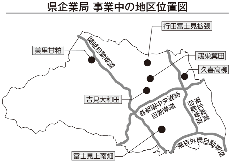 「久喜高柳(久喜市)、吉見大和田(吉見町)、美里甘粕(美里町)の3カ所を予定している。分譲面積は久喜高柳が約15・8ヘクタール、、吉見大和田が約13・6ヘクタール、美里甘粕が約6ヘクタール。分譲申し込みの受付期間や引き渡し時期は未定だが、いずれも高速道路ICに近く、企業からのニーズは高いと見ている」