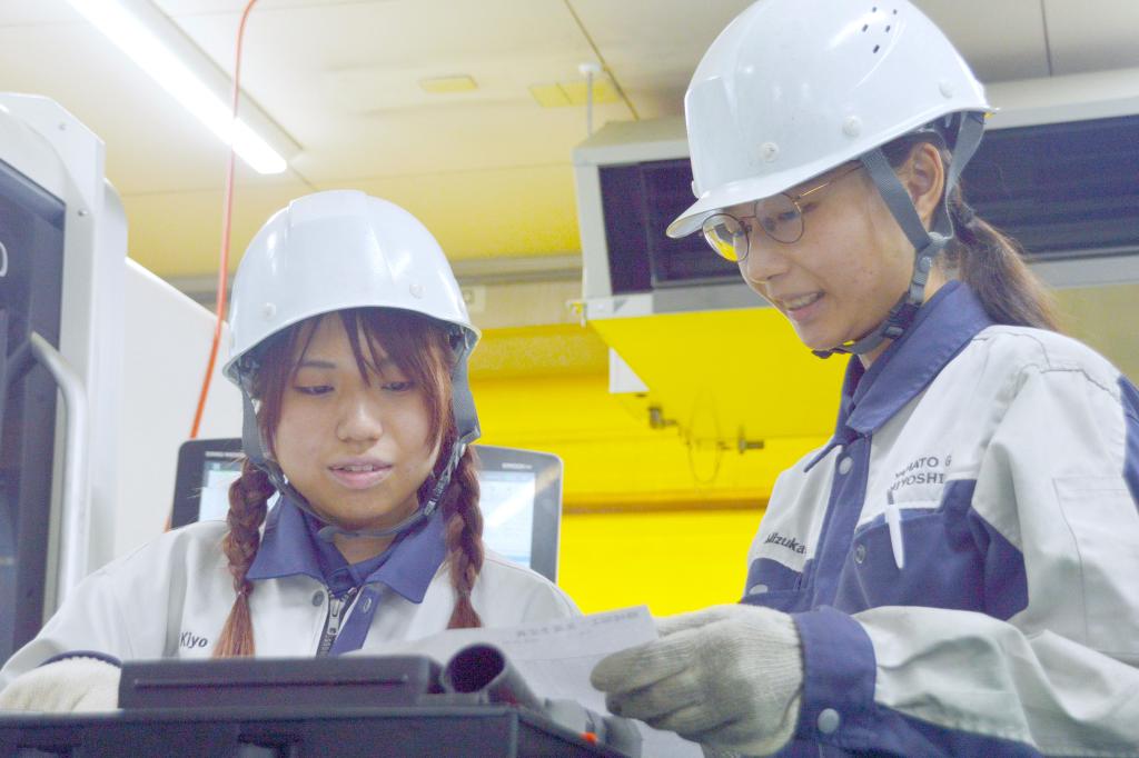 三芳合金工業(三芳町)の清凪颯(きよ・なぎさ)さん(左)と水川愛咲子(みずかわ・あさこ)さん(右)は、自動車向けの電極リングやワッシャーの機械加工で活躍中だ。これからの同社をけん引する人材として期待を集める同い年の二人は、「自分たちが作ったものが世の中に使われているのがうれしい。いいものを早く正確に作って、会社に貢献したい」と意気込む。